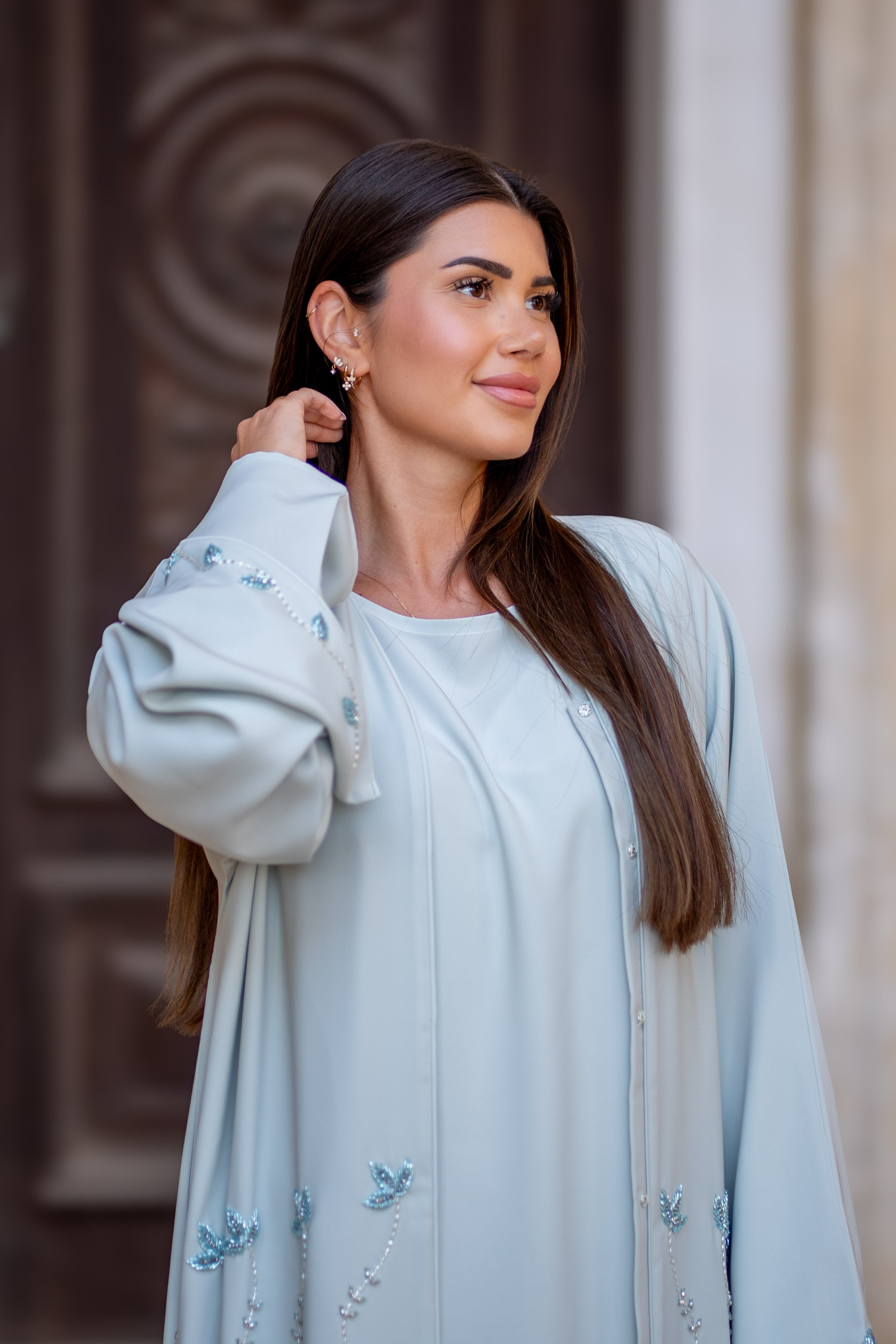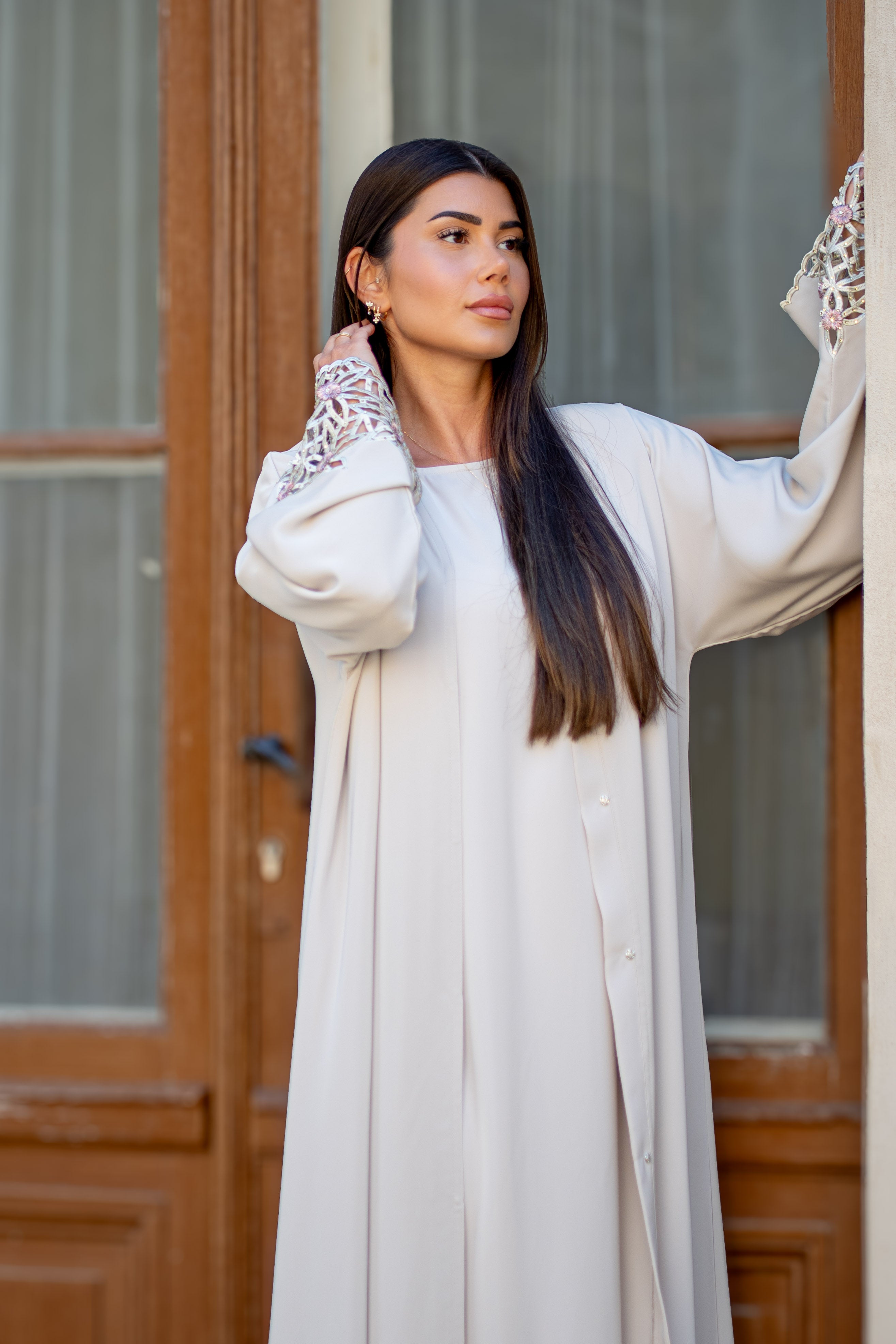 Ein heller, cremiger Farbton mit dezenten Stickereien, die wie feines Geflecht wirken. DIe Abaya fühlt sich leicht an, fällt weich und strahlt Ruhe aus - mit genau dem richtigen Maß an Besonderheiten.