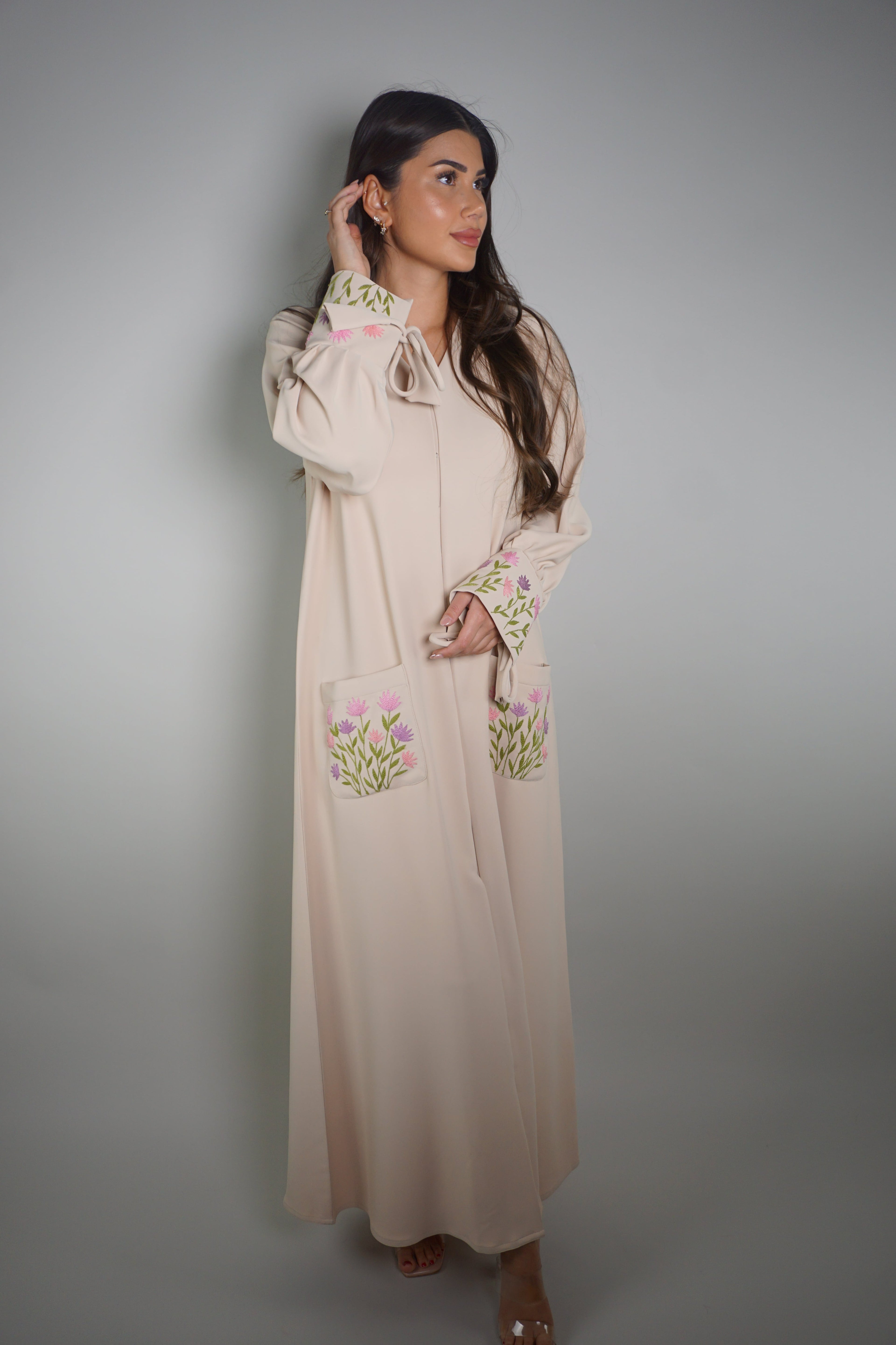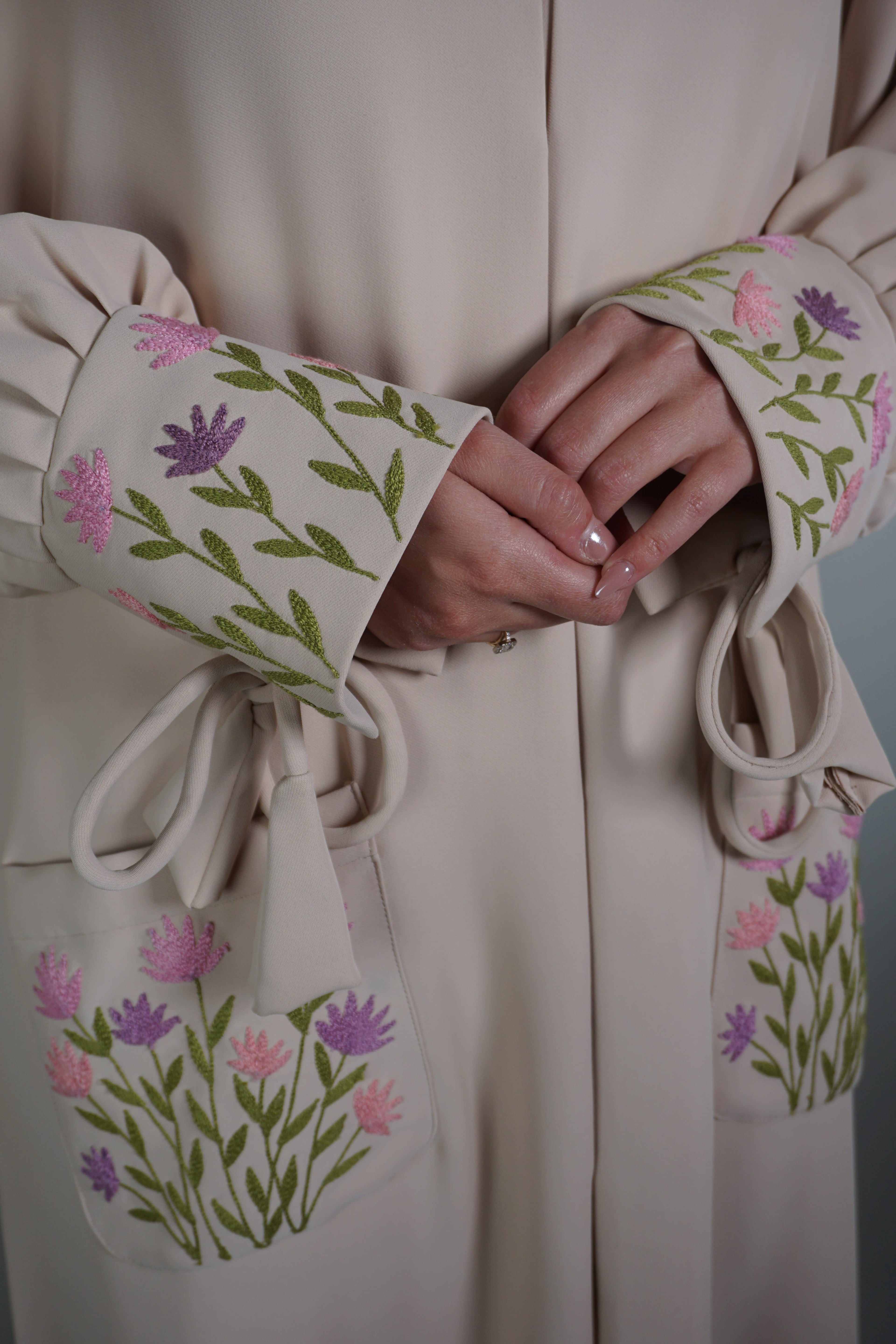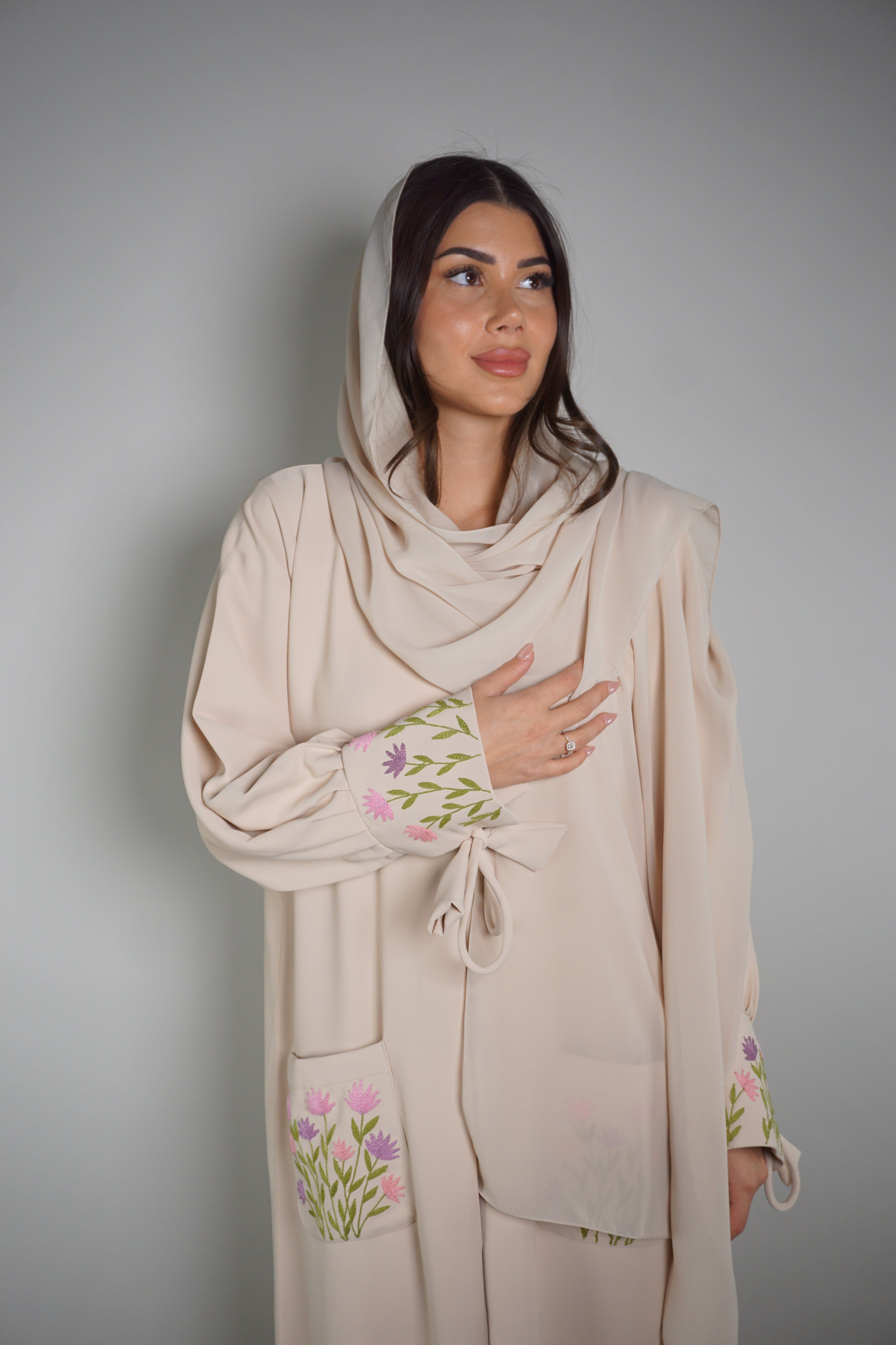 Die Pastel Garden Embroidered Abaya bringt frische Farben und zarte Stickereien in deinen Look. Die Blüten in Rosa, Flieder und Grün blühen an Ärmeln und Taschen auf und verleihen der Abaya eine verspielte, feminine Note.
