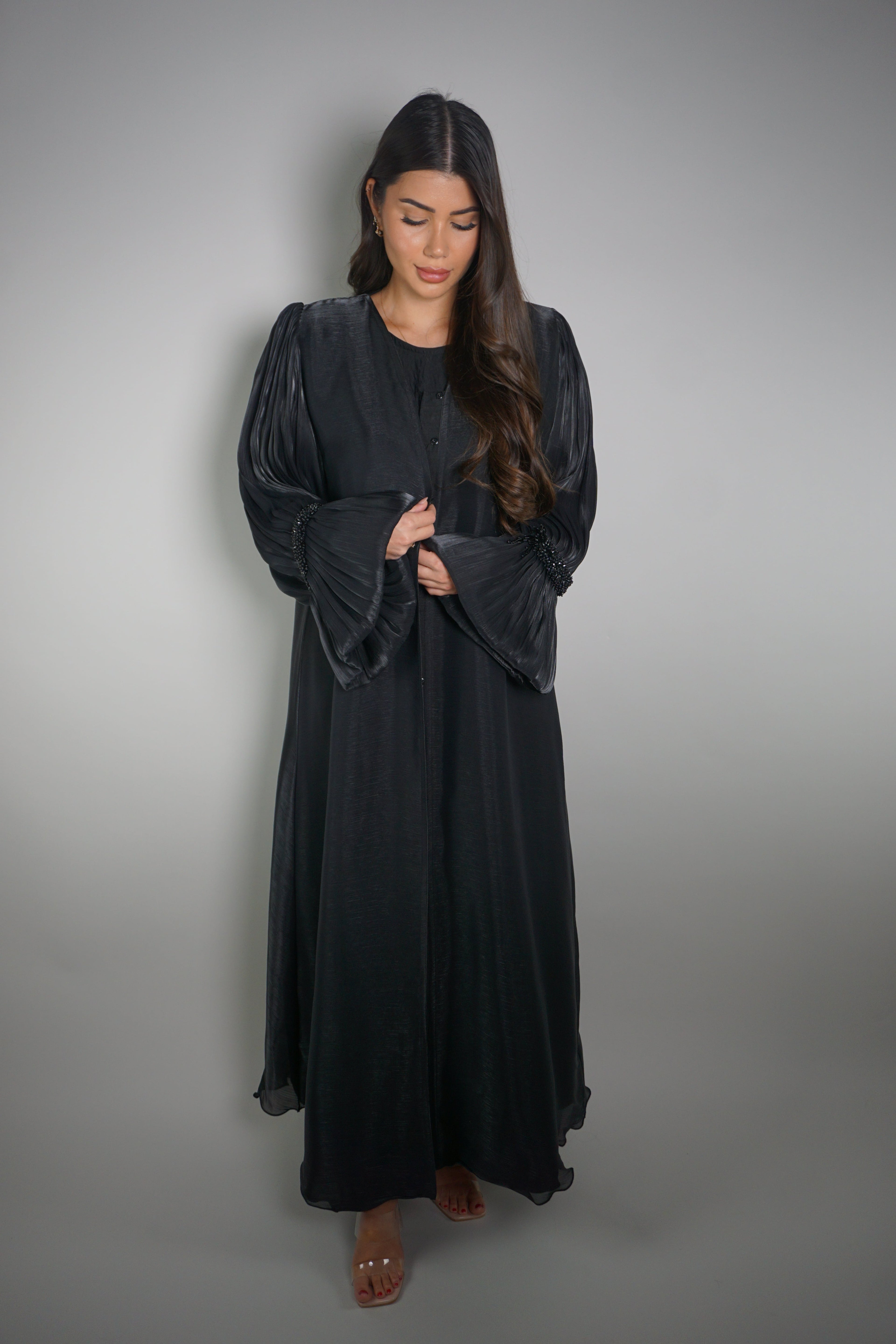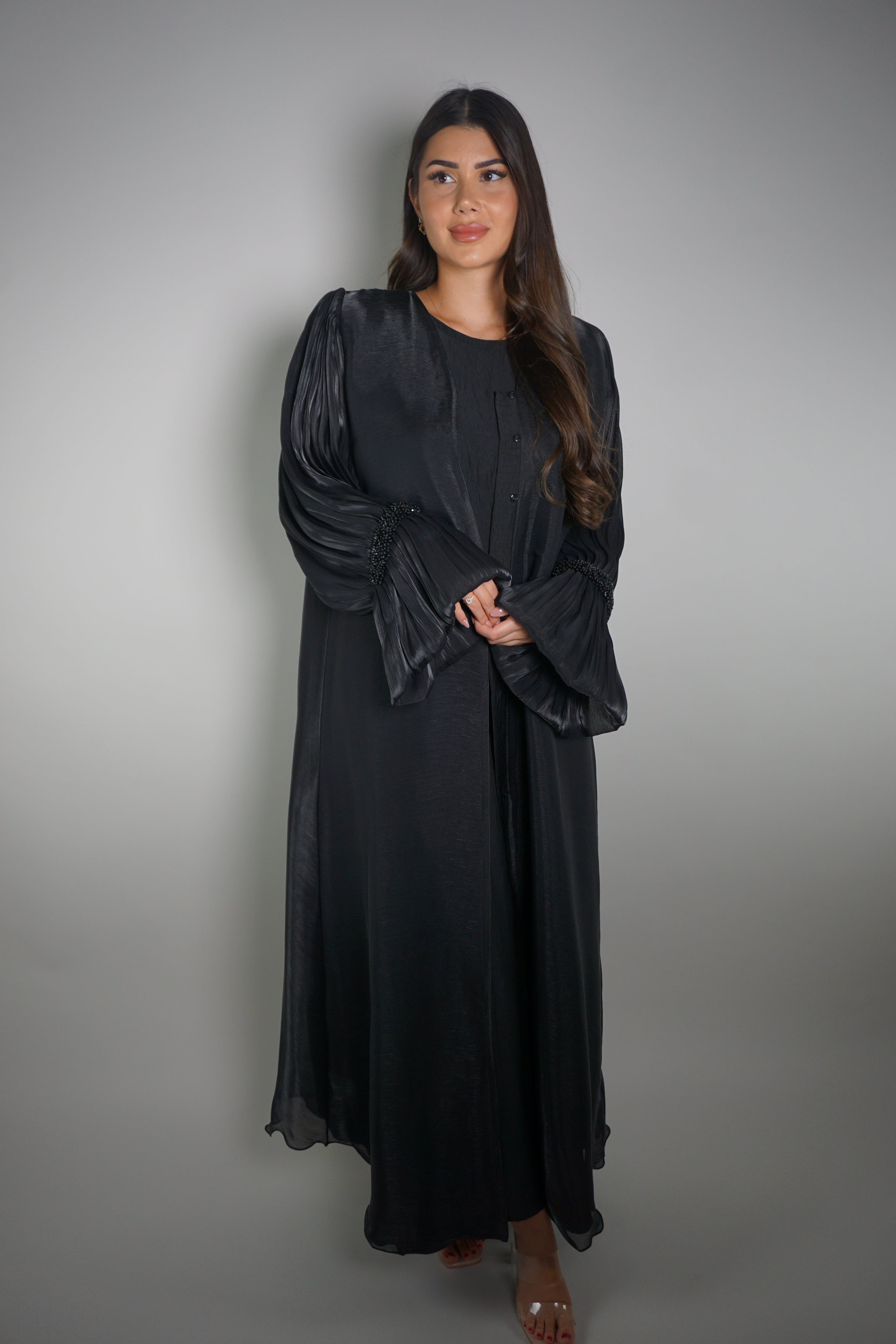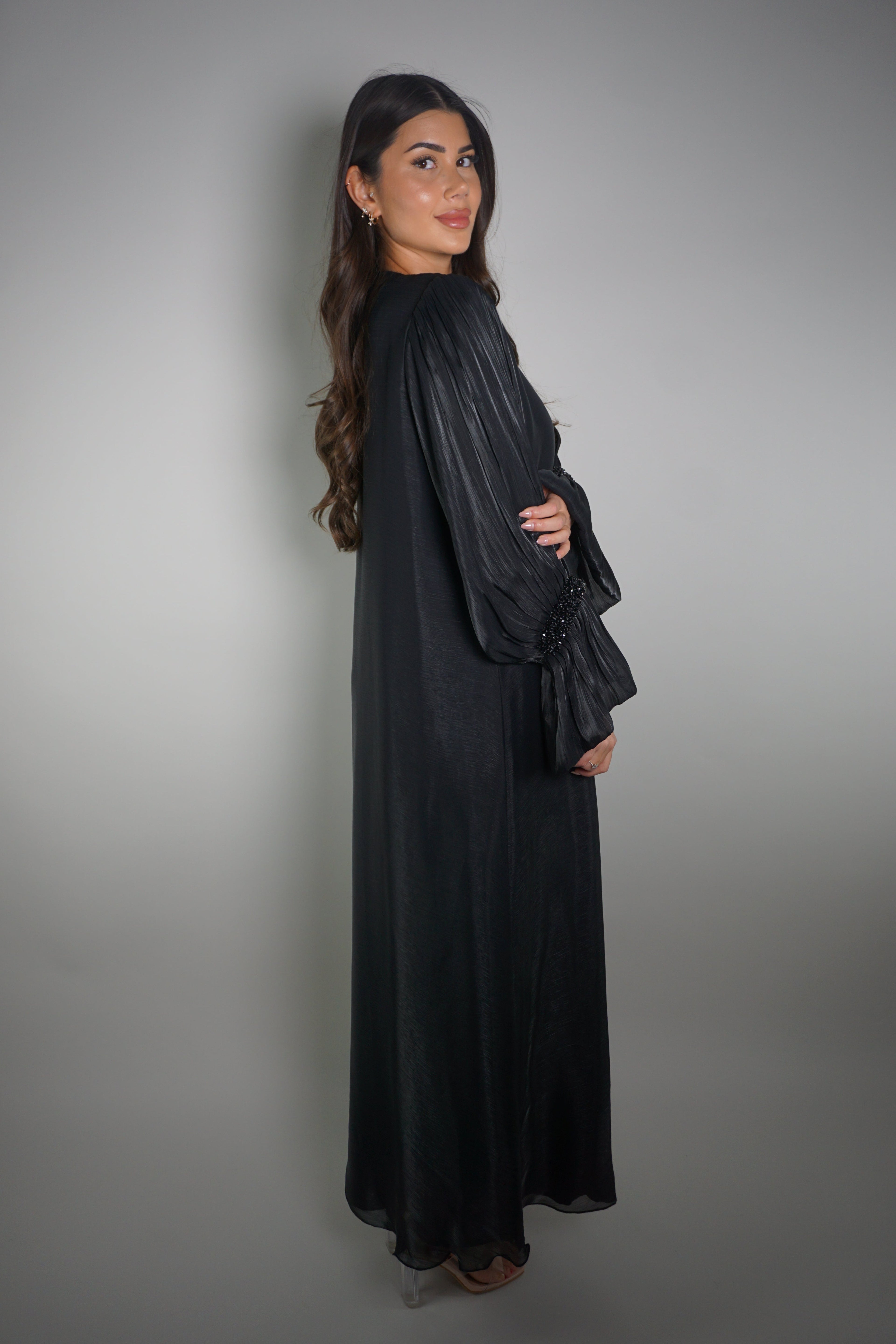 • Schlicht, edel und mit dem gewissen Etwas – die Black Plissé Sleeve Abaya kombiniert einen fließenden Schnitt mit fein gearbeiteten, plissierten Ärmeln. Dezente Steinverzierungen sorgen für einen stilvollen Akzent, der dem Look Tiefe verleiht, ohne laut zu wirken.