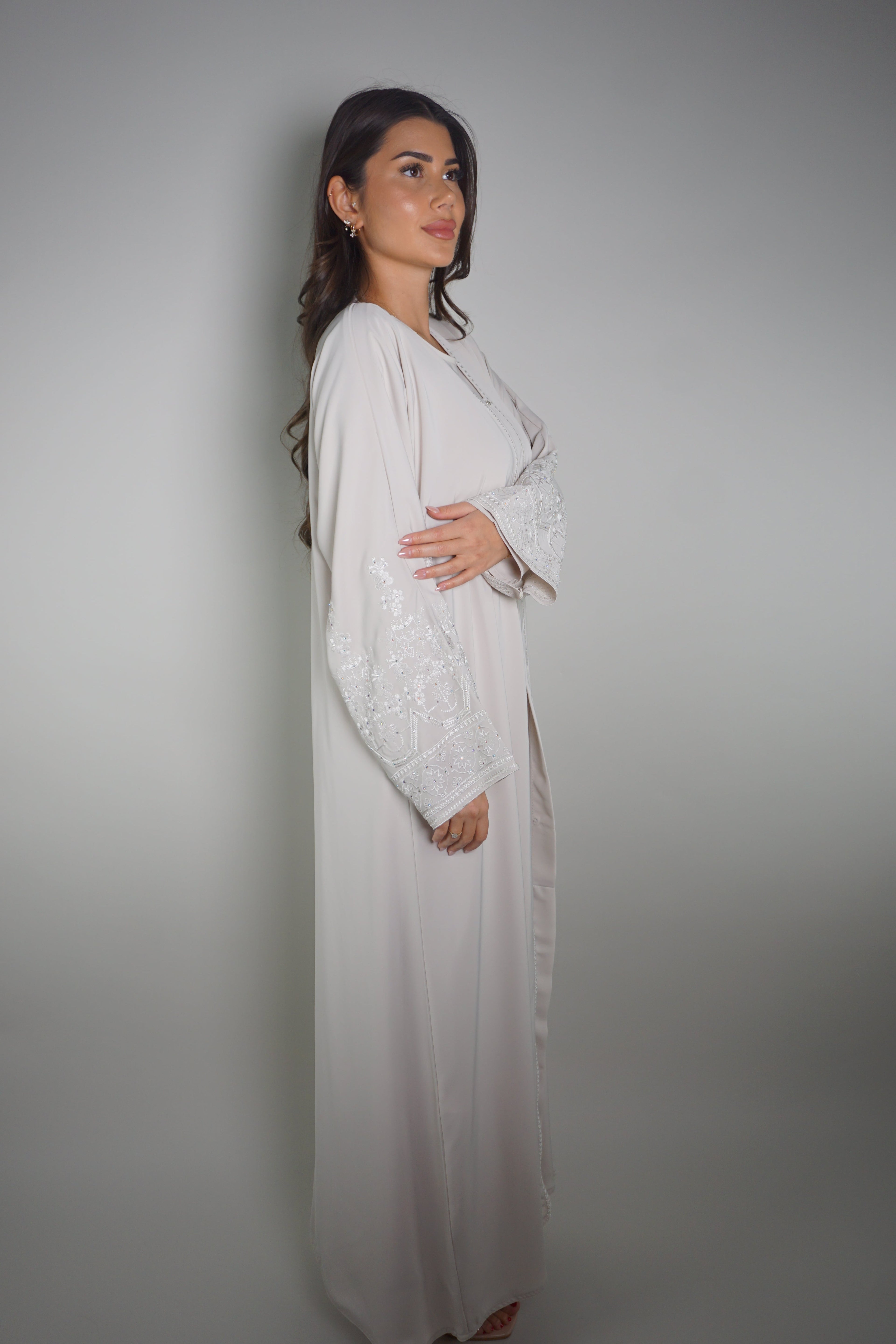 Die Creamlight Draped Thread Abaya vereint zarte Stickereien mit einem hellen, klaren Look. Der cremige Ton wirkt ruhig und hochwertig, während die feinen Details an den Ärmeln eine moderne Leichtigkeit einbringen.